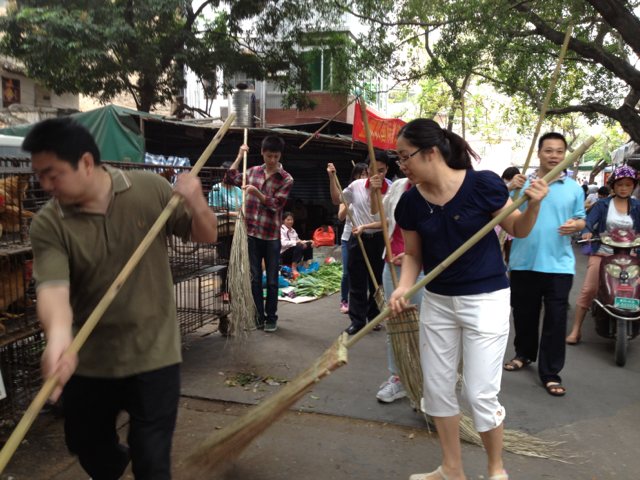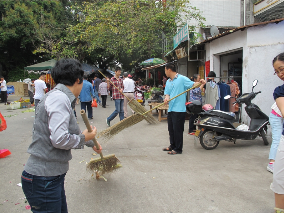 上午9时,后勤支部全体党员准时来在居委会报到,在党员志愿服务登记册上填写服务记录。居委会陶玉琼主任也陪同我们来到活动现场,为此次活动举行了简短的活动仪式。随后,在后勤支部书记蔡瑞强主任带领下,参加人员纷纷拿起扫把,发扬不怕苦,不怕脏的精神,完全不顾垃圾散发的恶臭和大风扬起的灰尘,主动打扫各种垃圾和污渍。经过一个多小时的辛勤劳动,打扫面积约1000多平方米,收集垃圾多达一吨,各处死角垃圾都被扫得一干二净,整个惠新东市场环境卫生面貌焕然一新。