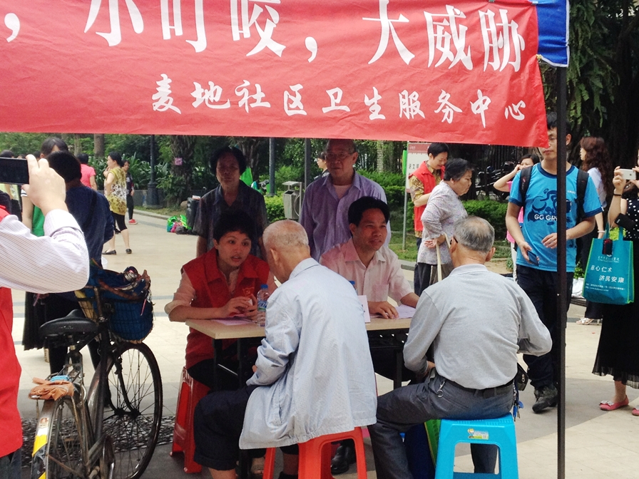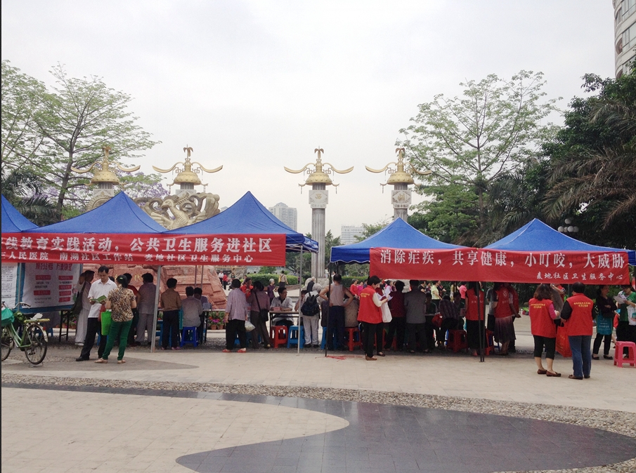 为认真贯彻落实惠城区委、桥西党工委和区卫生局党委关于开展党的群众路线教育实践活动的有关精神,结合辖区内的实际情况,在教育实践活动中,充分发挥党员干部的带头作用,进一步增进与辖区内群众的感情,切实做好惠民、利民服务,4月28日,惠城区卫生局、市第三人民医院、惠城区慢病站、麦地社区卫生服务中心及南湖社区工作站等多个单位于惠城区南门公园门口联合开展义诊活动,为辖区内的群众建立健康档案,测量血压、血糖,进行心电图和骨密度检查,提供疾病咨询等基本医疗服务,同时我院还向市民群众开展心肺复苏急救技能的现场教学。