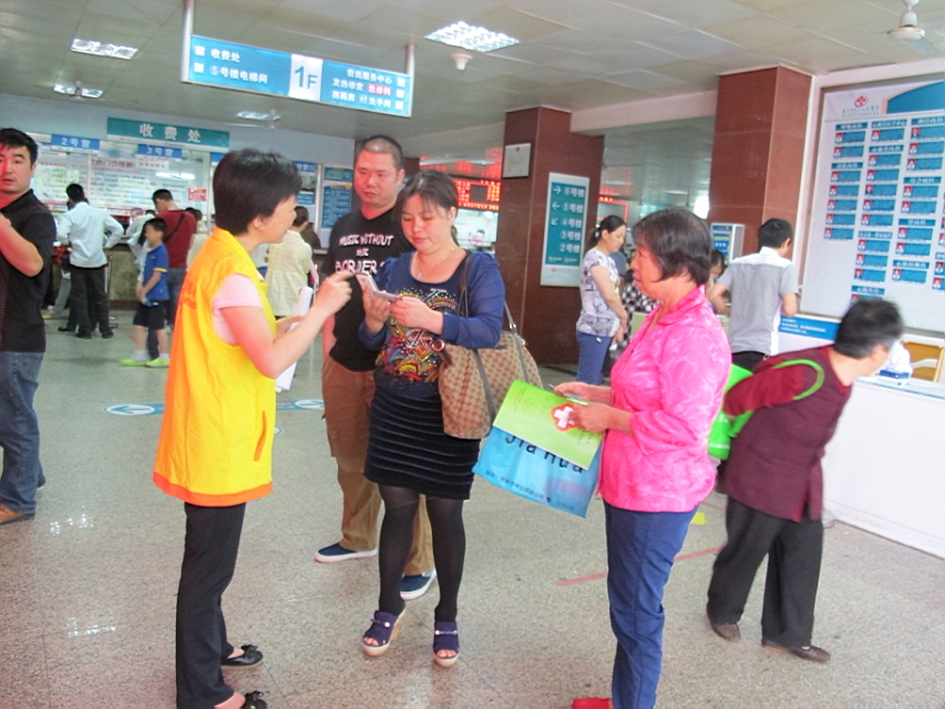 活动成员由4名院内志愿者及3名党员(来自院内行政科室人员)及5名共青团成员(来自不同临床科室的年轻护士们)组成。活动分别于门诊建卡处、药房、输液室、儿科门诊、二楼抽血处、门诊一楼及二楼收费处各安排两名人员,由志愿者及共青团员引导门诊患者有序就医,及时解决患者就医困难,并及时收集患者反映意见建议。由于共青团成员均来自于临床,对一线门诊的就诊环境不了解,志愿者们以长辈的身份教导青年们,从而拉近两代人的距离。同时让志愿者及共青团成员了解门诊治疗的全过程,体验患者就医感受。