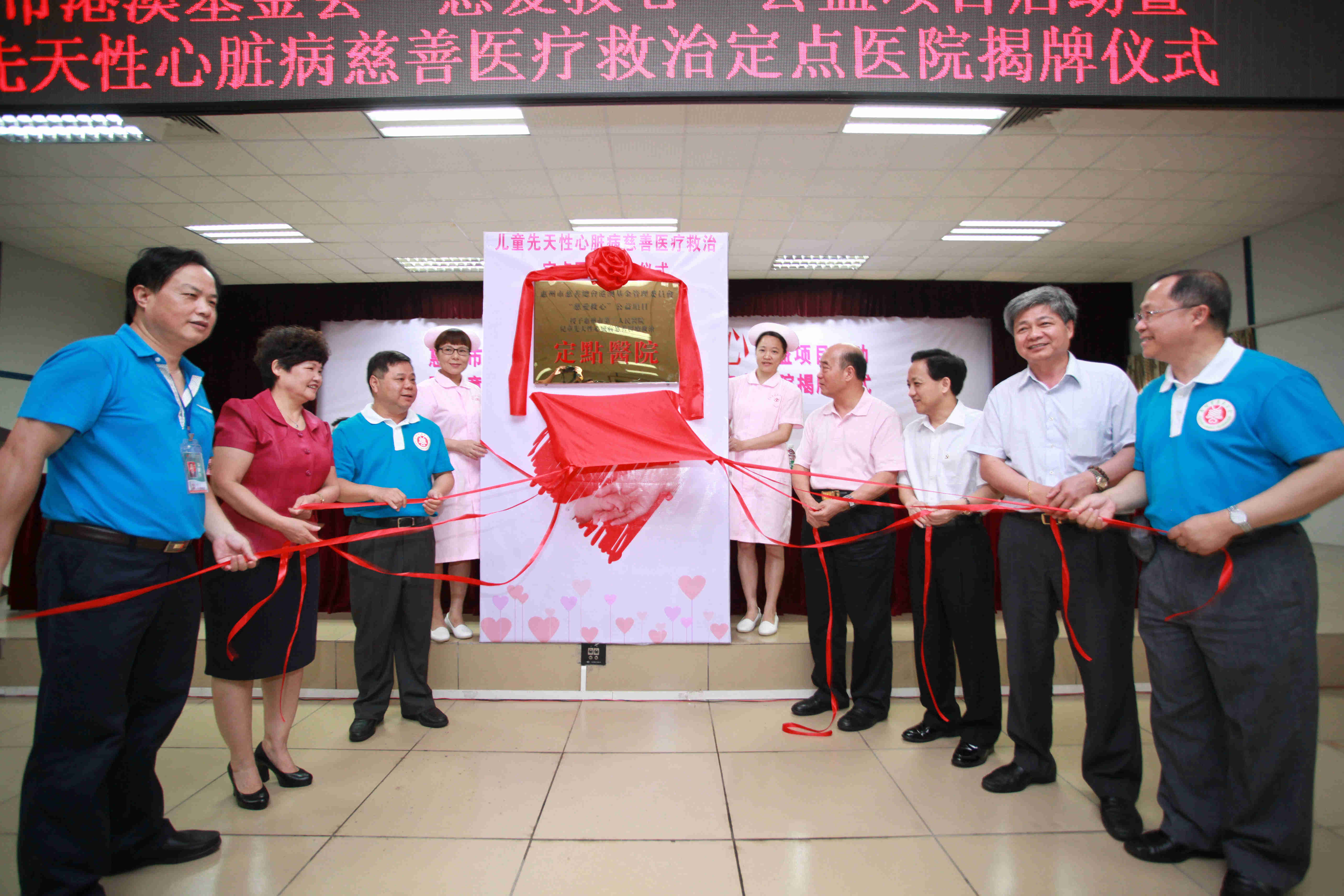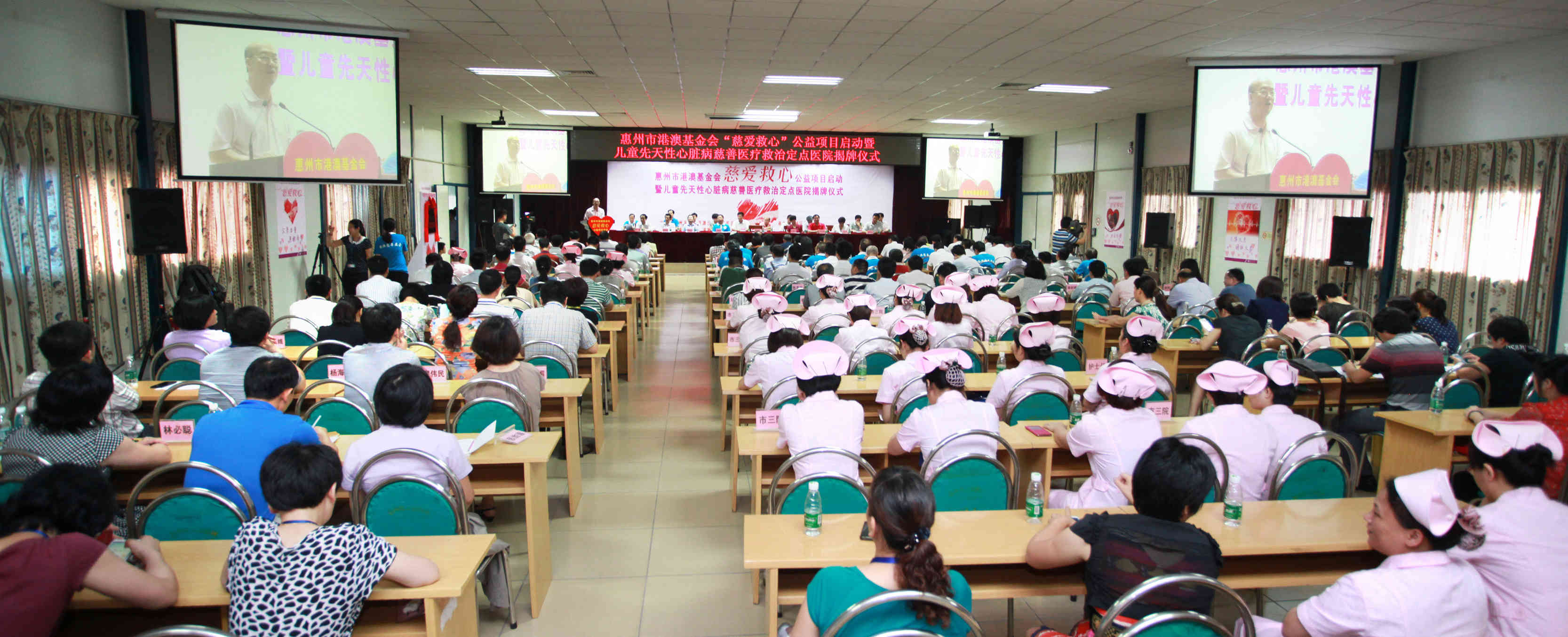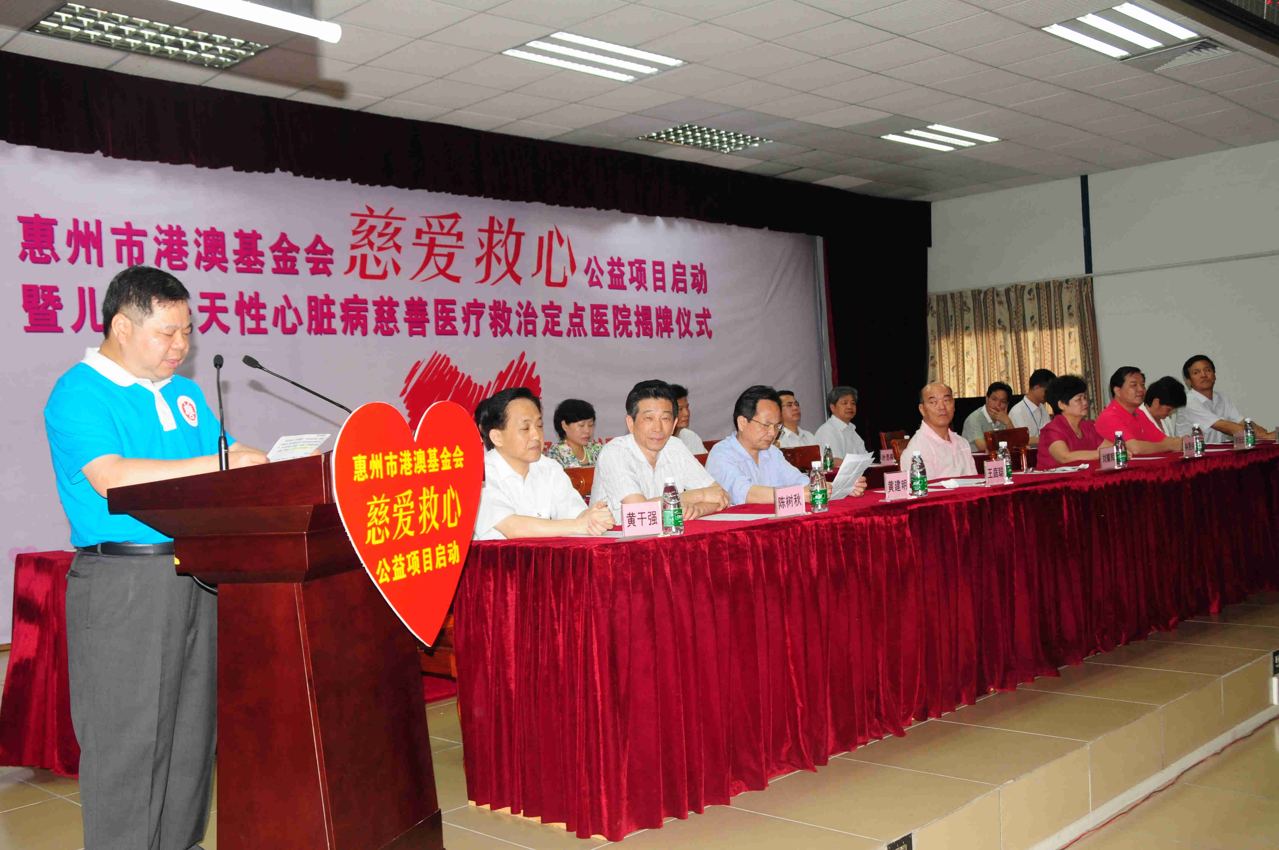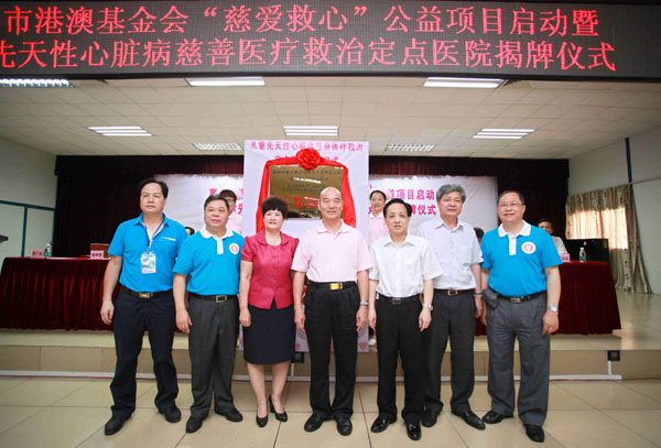 2014年5月28日上午,惠州市港澳慈善基金会“慈爱救心”公益项目启动暨儿童先天性心脏病慈善医疗救治定点医院揭牌仪式在惠州市第三人民医院多功能会议厅隆重举行,市政协刘耀辉主席率市政协、市民政局、市慈善总会、市港澳慈善基金会、市卫计局等市直单位近80人参加了仪式,区委书记黄干强及区政协、民政等相关区属单位领导以及惠州各大媒体记者、市三院职工等现场200多人共同见证了这一善举,向全社会传播了公益慈善正能量。
