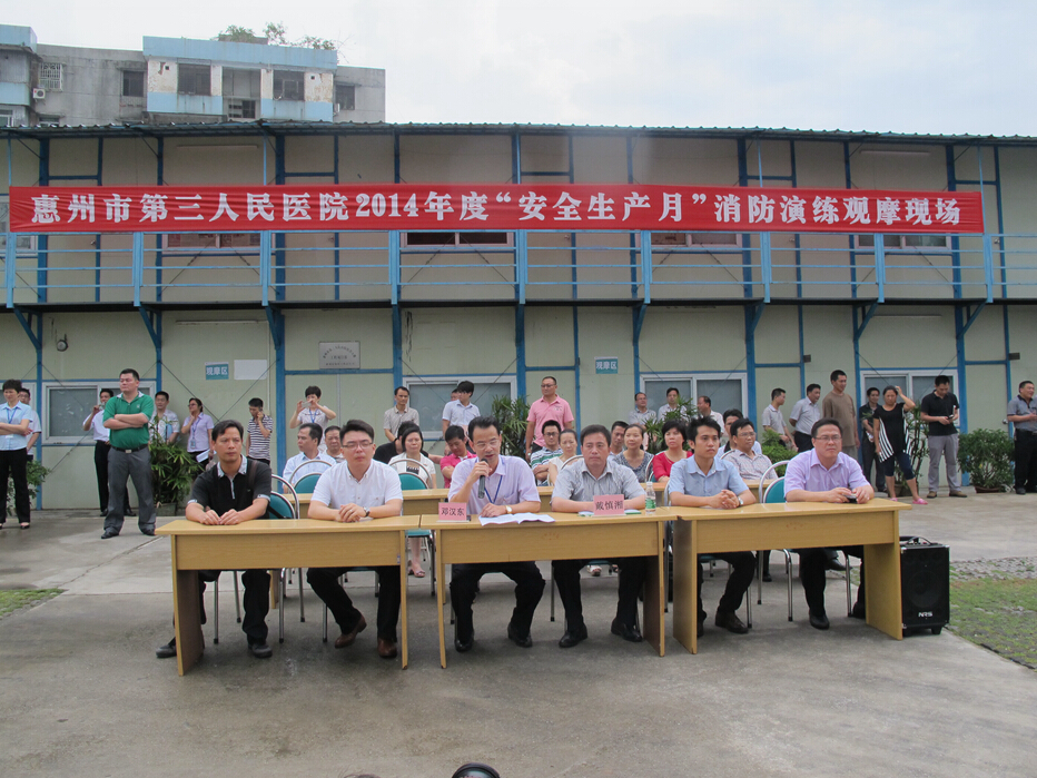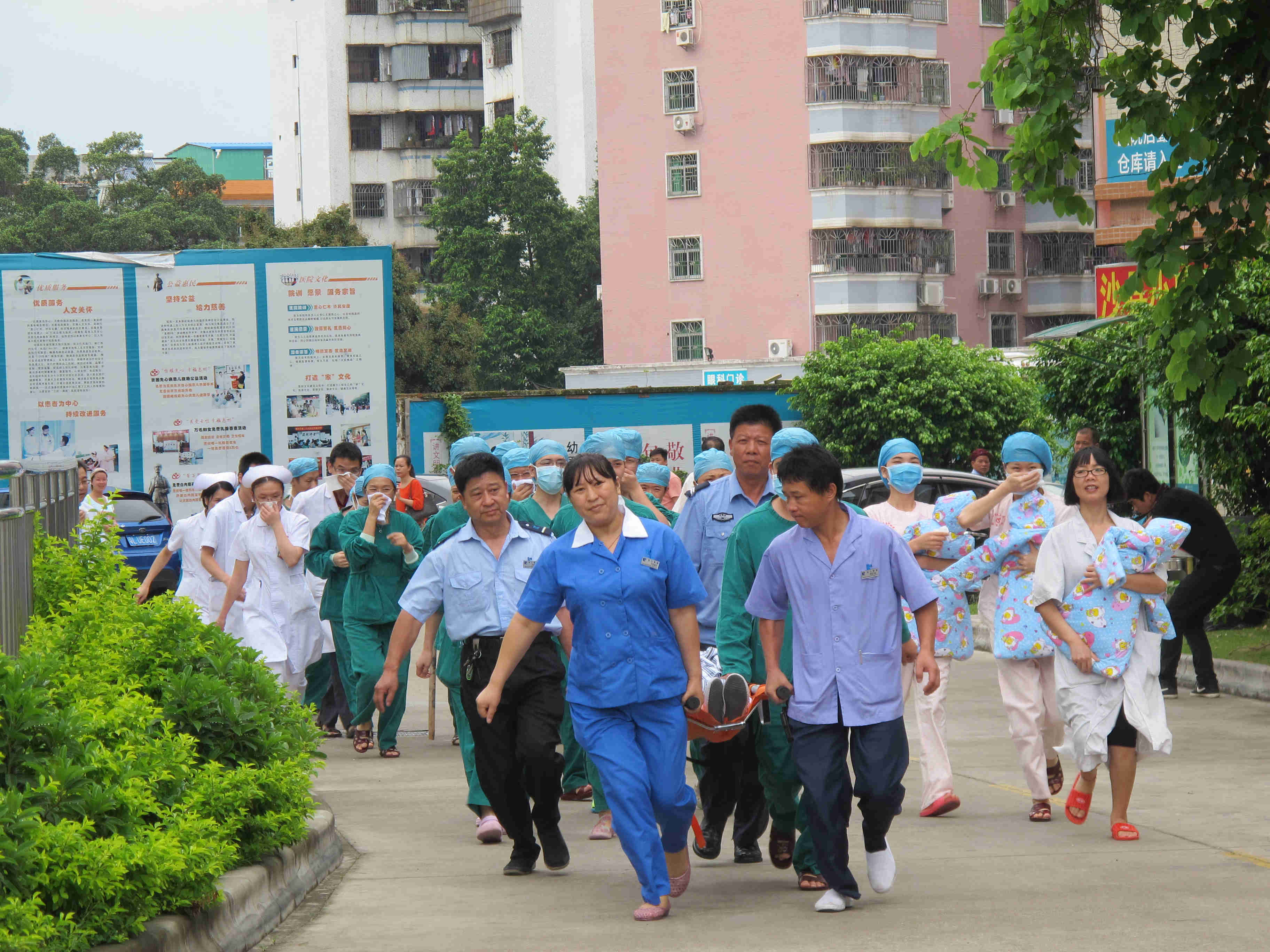 原来这是我院在举行2014年“安全生产月”消防演练。此次演练由邓汉东书记任指挥长,杨海康主任负责组织演练工作。区卫计局领导、社区中心主任等也莅临现场观摩指导演练工作。