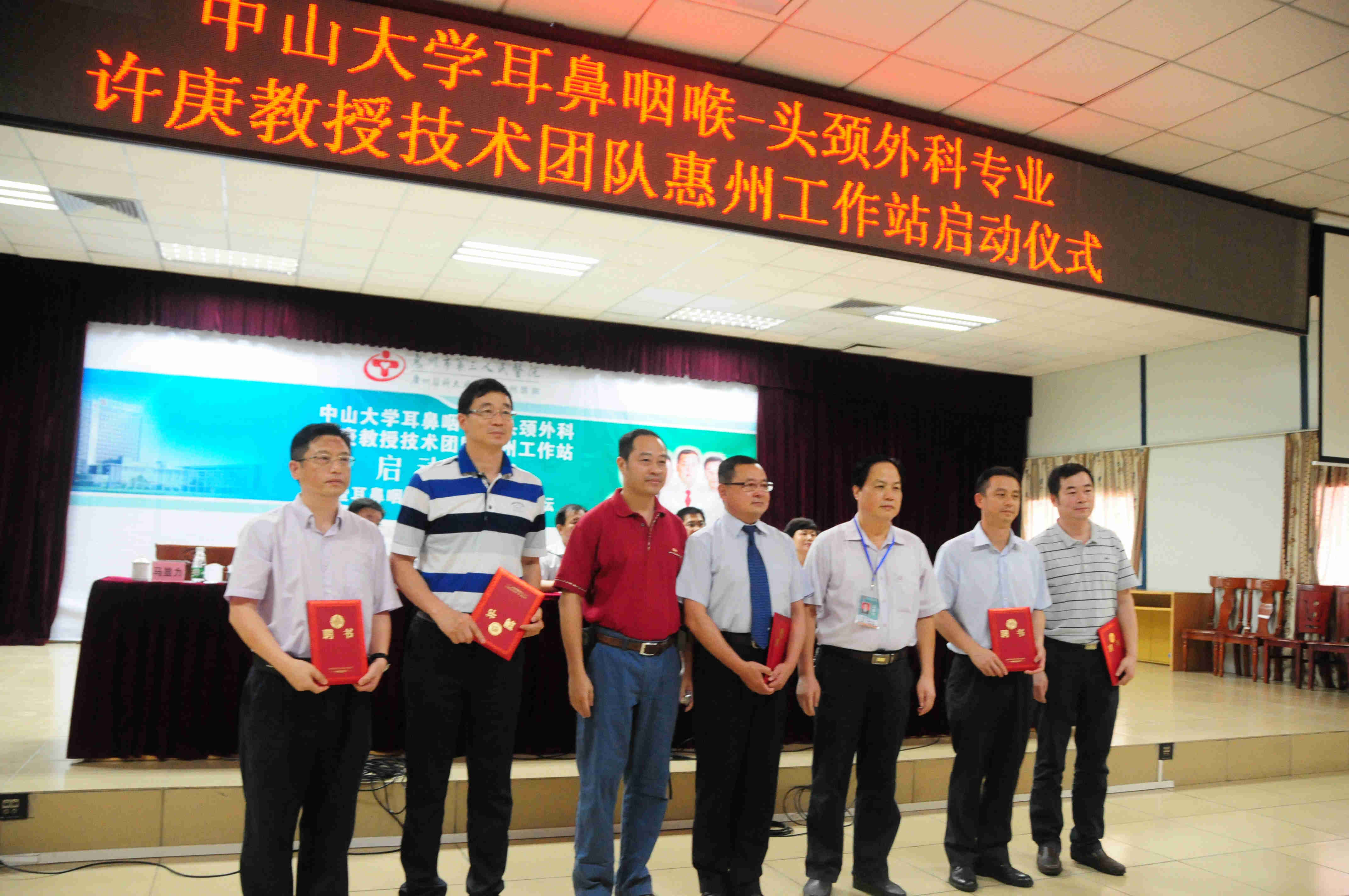 揭牌领导:市政协副主席许玩宏(左三);区委副书记、区政府主要负责人林利育(右二);中山大学附属第一医院耳鼻咽喉科医院首席专家许庚教授(右三);市卫生计生局党组成员、市计划生育协会会长邝文(左二);市委保健办主任肖剑(左一);惠州市第三人民医院院长马显力(右一)