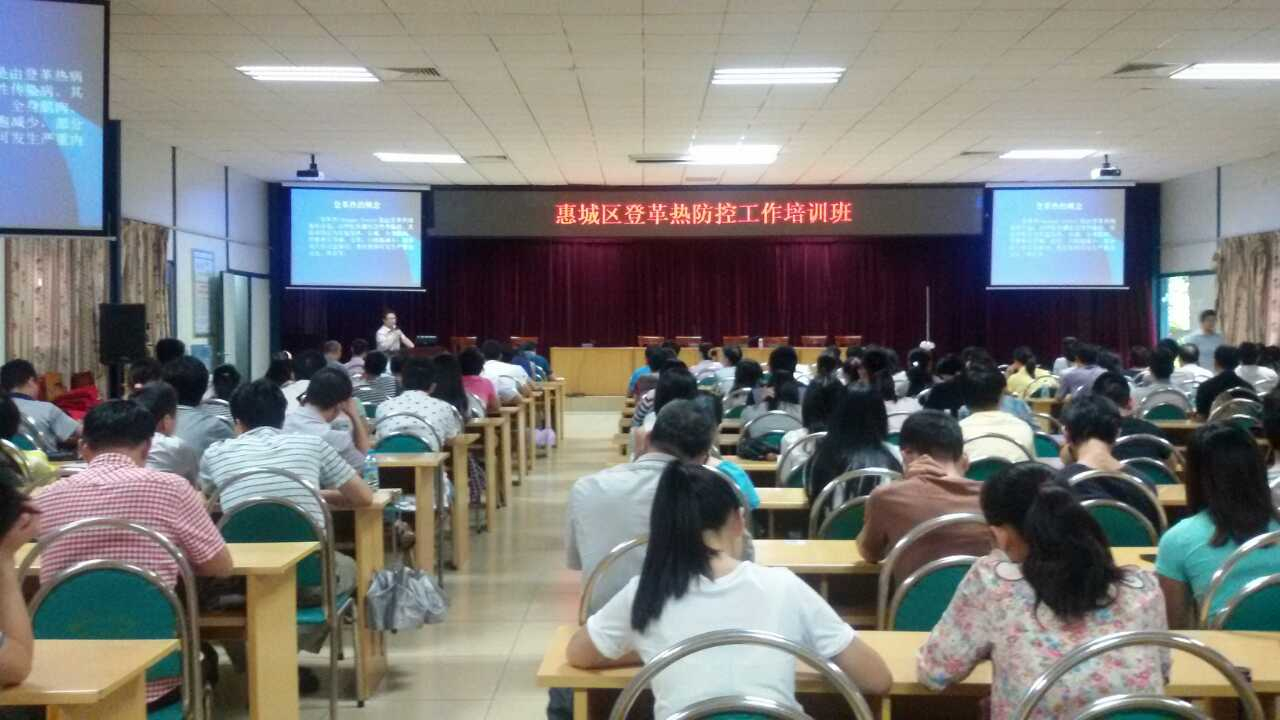 近期,我省广州市发生由蚊子传播登革热疫情,报告病例达1000多例,存在向周边城市扩散的可能。当前我省气候适宜蚊媒滋生,蚊媒密度监测数据创2006年以来新高,登革热疫情防控形势相当严峻,由于人群普遍易感,为做好疫情防控,做到“早发现、早报告、早隔离、早治疗”,根据上级主管部门和院领导的指示,在区卫计局组织下,2014年9月16日下午15:00至17:00,我院感染内科利旭辉主任在工地多功能会议室为大家进行了关于登革热疫情防治相关知识的培训。惠城区其他医疗机构负责传染病管理的分管理领导及传染病防控人员以及本院医务人员共计227人参加了此次培训。