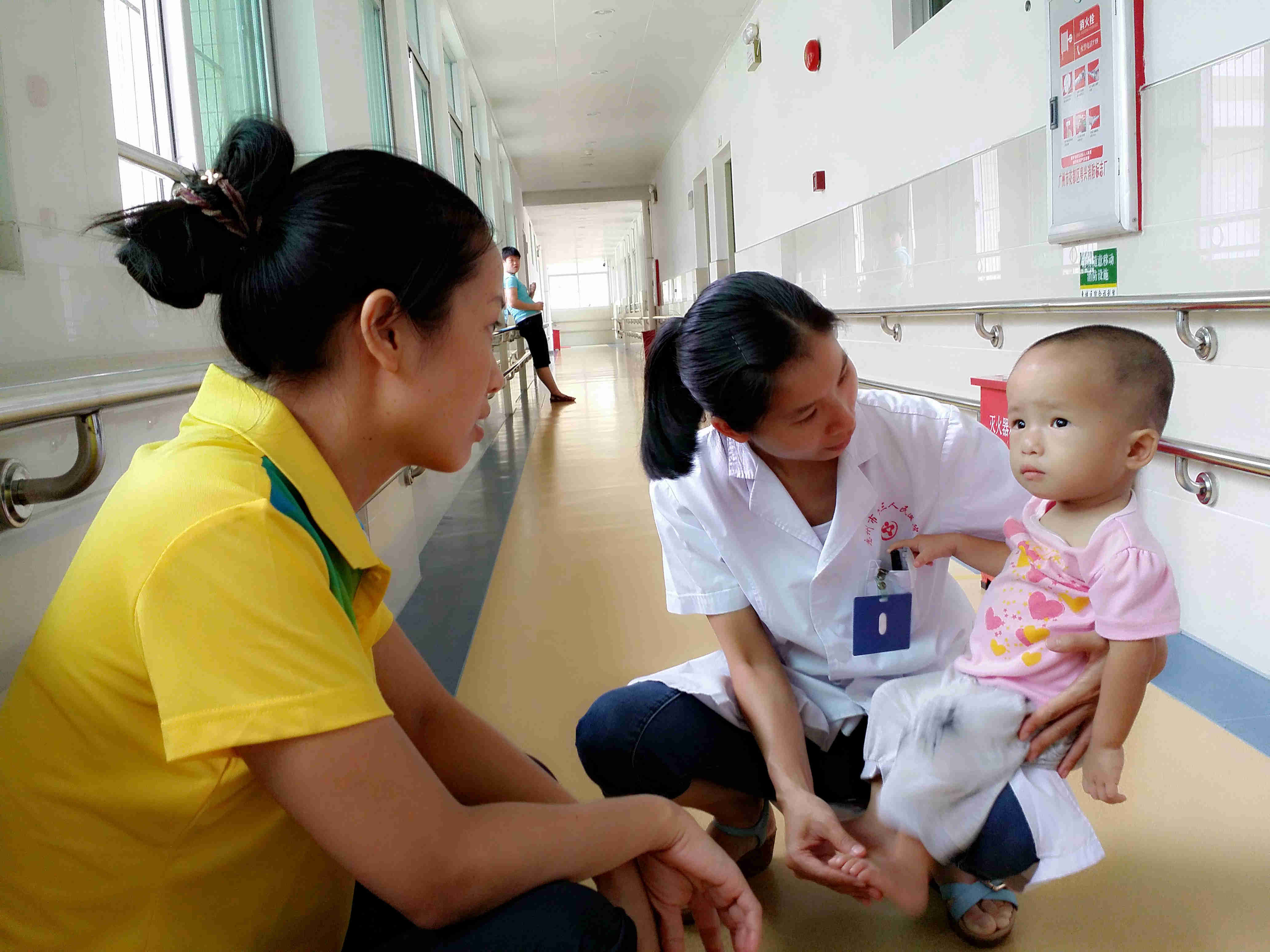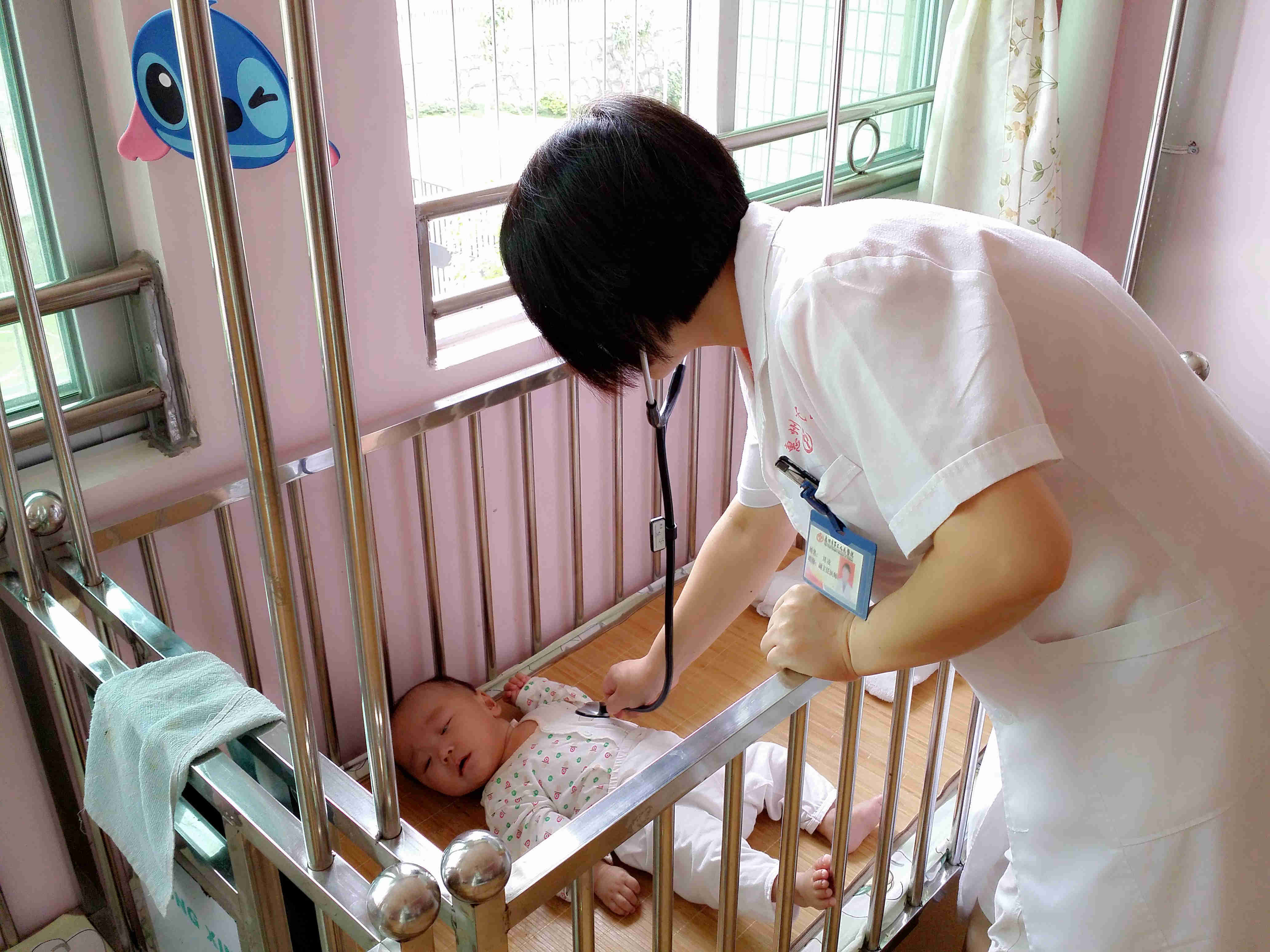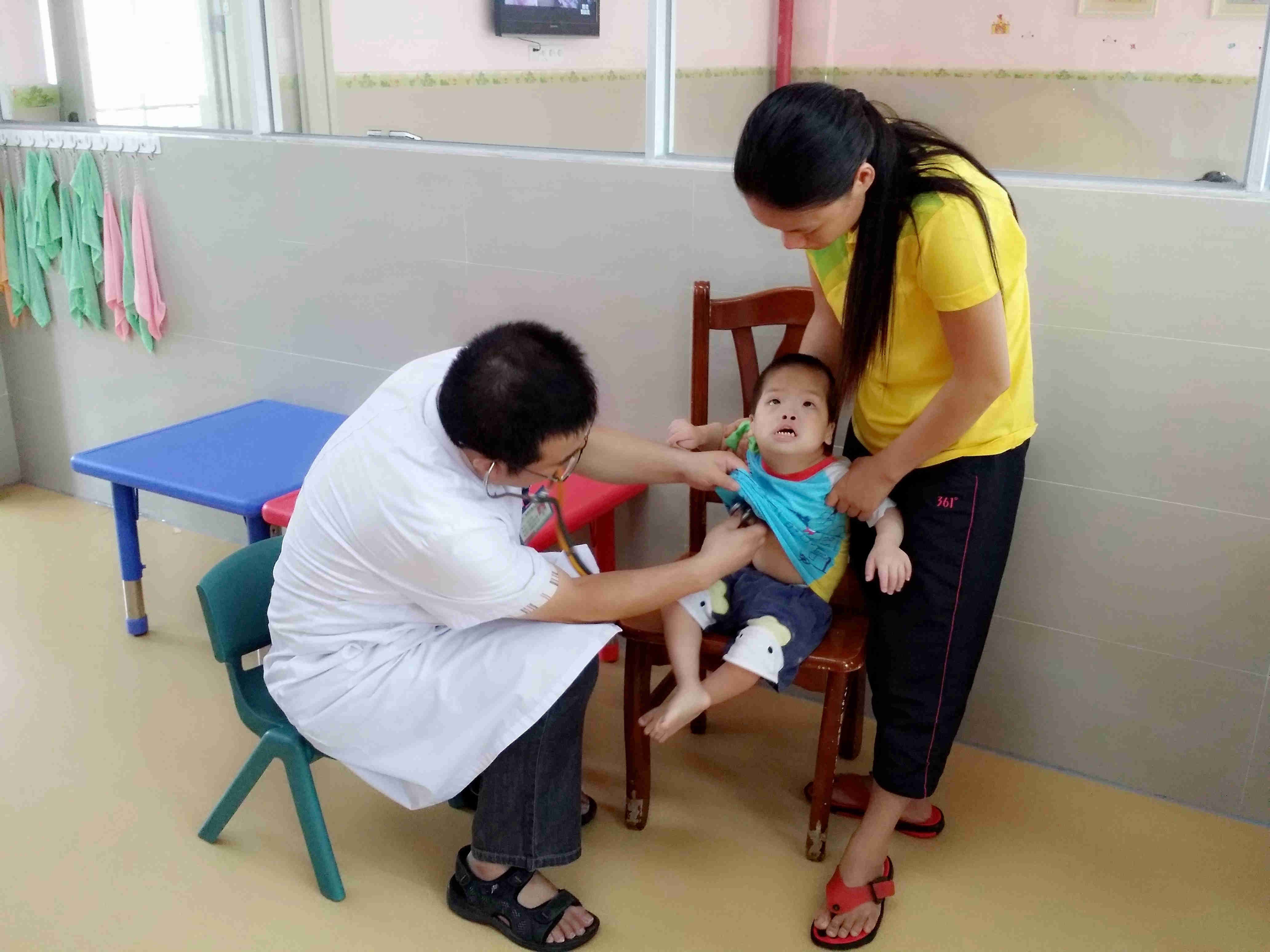 走进福利院的儿童部,我们俨然置身于一个童话世界,游乐设施应有尽有、标识设计五彩缤纷,还有沿走廊墙壁的步行扶手都让人觉得很有爱。上至二楼,一块小黑板上记录着保育阿姨们今天要特别留心的安排,“17日早第三人民医院来给小朋友检查”,简短的留言让我们感受到对我们医务人员的一份期待。我们首先来到了一个房间,里面都是一些先天愚型和脑瘫的宝宝,看着他们无辜的眼神让人觉得很揪心。几位医生轮流为小朋友们听诊心肺、评估肌张力和生长发育情况,并为心脏有杂音的小朋友行心脏彩超检查,共筛查出不同类型的先心病患儿4名,且不同程度的伴有其他残障。钟卫权主任跟福利院的儿科医生详细讲解了几个孩子的病情及相关治疗方案,希望能尽量对孩子们有所帮助。