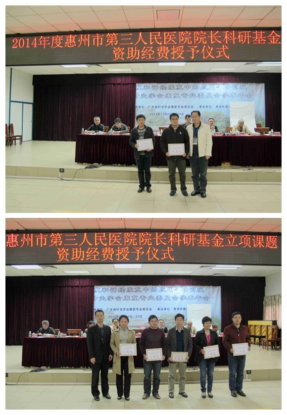 邓汉东书记首先宣读了《关于下达2014年度惠州市第三人民院院长科研基金立项课题的通知》文件,对获得院长科研基金经费资助的各项目负责人表示祝贺。随后,马显力院长、邓汉东书记、肖纯副院长分别给获得2014年度院长科研基金立项课题的负责人授予了资助经费。