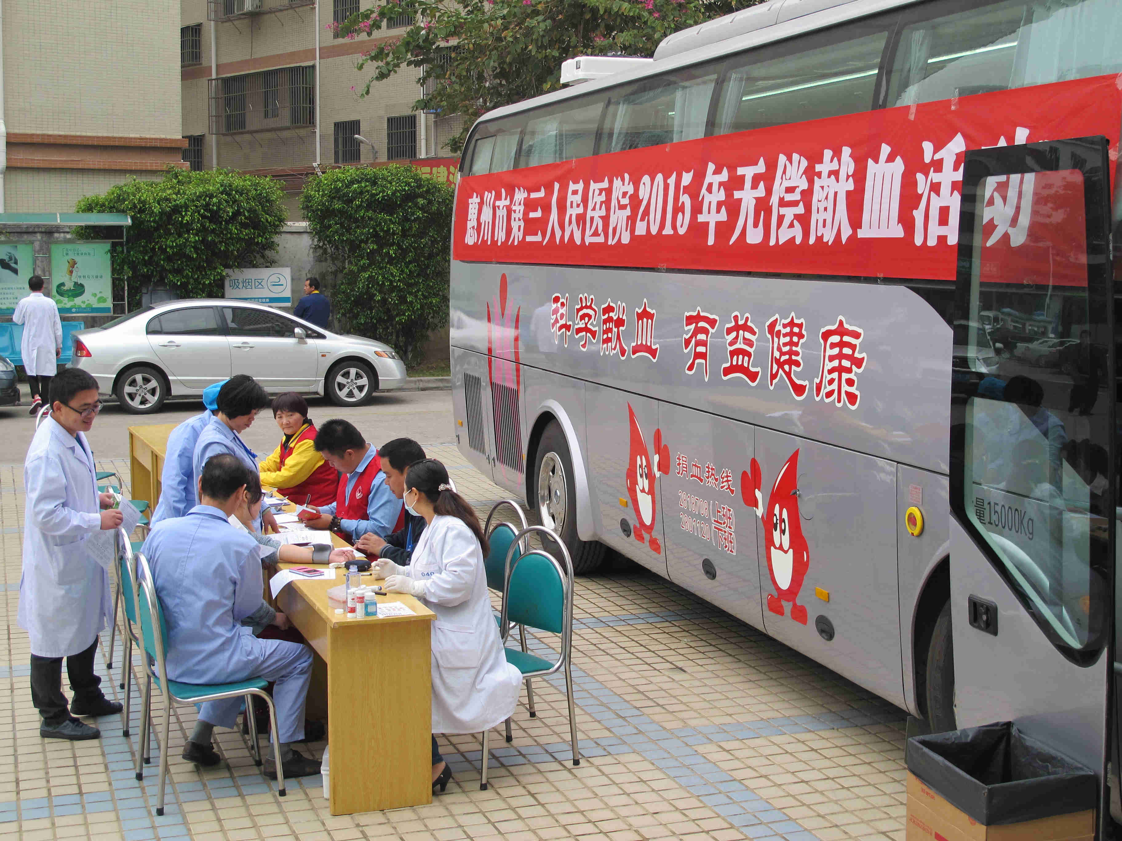 2015年3月5日是全国第52个学雷锋纪念日,为弘扬雷锋精神,缓解春节过后惠州用血压力,3月3日上午,惠州市第三人民医院和惠州中心血站在医院住院大楼门口开展了“学雷锋 为人民”无偿献血活动,三院员工包括保安清洁人员都积极响应医院号召,纷纷前来参与献血,活动共有100人参与,总献血量超过3.2万毫升。