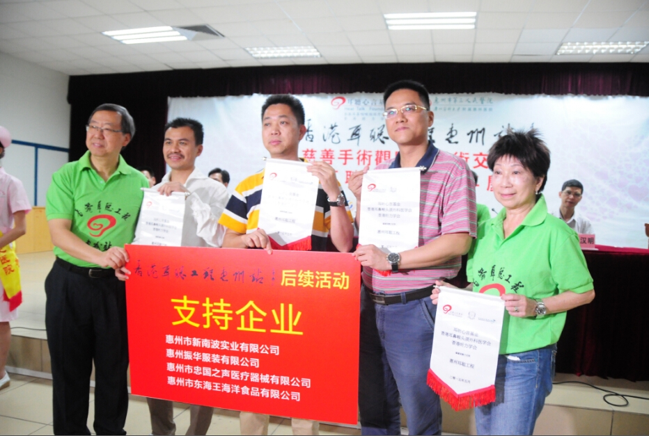 本次活动由香港“耳听心言”基金会和惠州市第三人民医院联合举办,惠州市汕尾商会慈善捐助。当日上午,惠城区委常委、区人大常务副主任陈娟同志,惠州市残联理事长曾建廷同志,惠城区卫计局党委书记、局长邹忠平同志,惠州市卫计局医政科科长谢汉明同志,香港“耳听心言”基金主席唐志辉教授,香港“耳听心言”基金副主席邓树安医生及基金会相关领导,香港及国内一流耳科专家(名单附后),惠州市慈善总会副秘书长曾焕添同志,汕尾商会执行会长林文填先生及汕尾商会相关领导等领导嘉宾出席了“耳聪工程”惠州站启动会议。来自中央电视台卫生频道、中国新闻社、广东电视台珠江频道、南方日报、南方都市报、惠州电视台、惠州日报、东江时报、社会与公益杂志等多家媒体的记者朋友们也参与了本次活动。