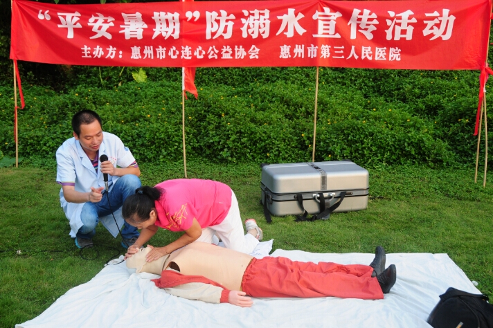 惠州市志愿救捞队队长赵喜昌介绍了惠州今年以及往年游泳溺亡情况,呼吁大家必须重视游泳安全,提醒大家游泳决不能单独一人,必须要用好的同时系着安全绳的游泳圈,会游泳的更不能掉以轻心忽视安全等等。随后惠州市第三人民医院急诊科林月雄医生教现场的市民群众如何根据溺水者的不同状况进行施救,并让他们体验了如何正确进行心肺复苏抢救溺水者和患者。