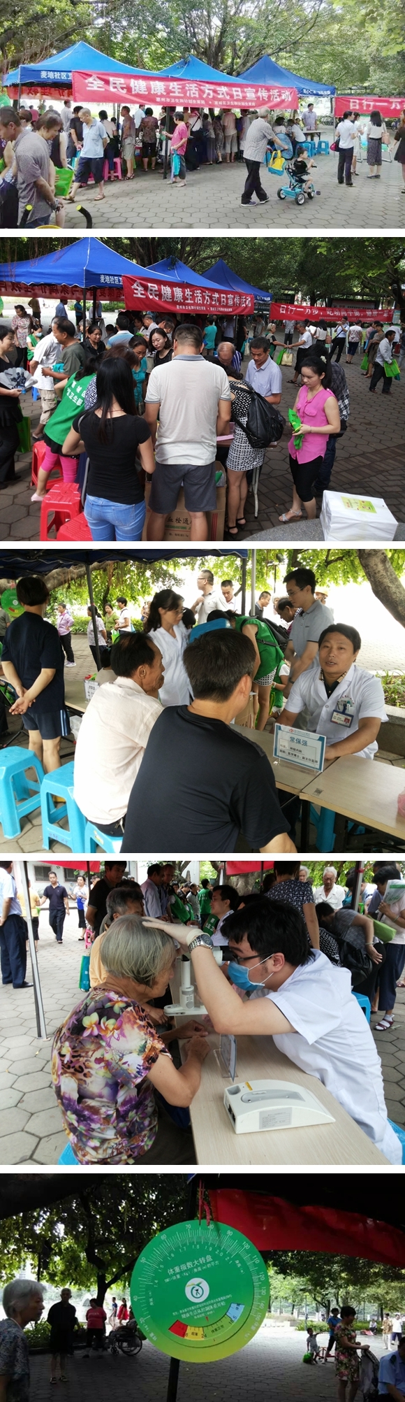 2015年91日是我国第九个“全民健康生活方式日”,由惠州市疾控中心、惠州市卫计局、惠城区卫计局、惠州市第三人民医院和麦地社区卫生服务中心联合举办的“日行一万步,吃动两平衡,健康一辈子”全民健康生活方式行动日大型义诊宣传活动在南苑公园(海湖大酒店对面)举行。