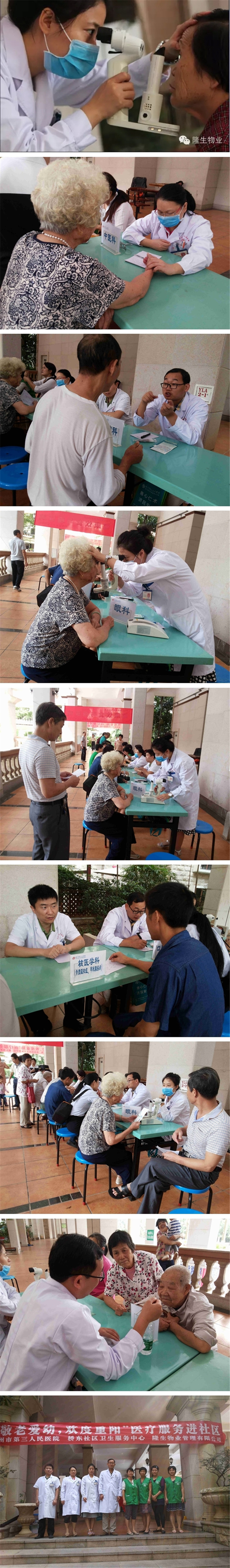 我院组织中医科、眼科、口腔科、核医学科及桥东社区中心共计9名医务人员志愿者为社区居民进行免费健康咨询。义诊服务项目包括:建立健康档案;测量血压、血糖;解答居民常见病、多发病的预防、治疗、饮食卫生注意事项,重点是中医把脉、眼科疾病、口腔疾病、骨质疏松、甲状腺疾病健康咨询。物业工作人员也忙着为老人搬凳子,做好各项服务,吸引了社区居民前来咨询问诊,尽可能帮到更多居民。