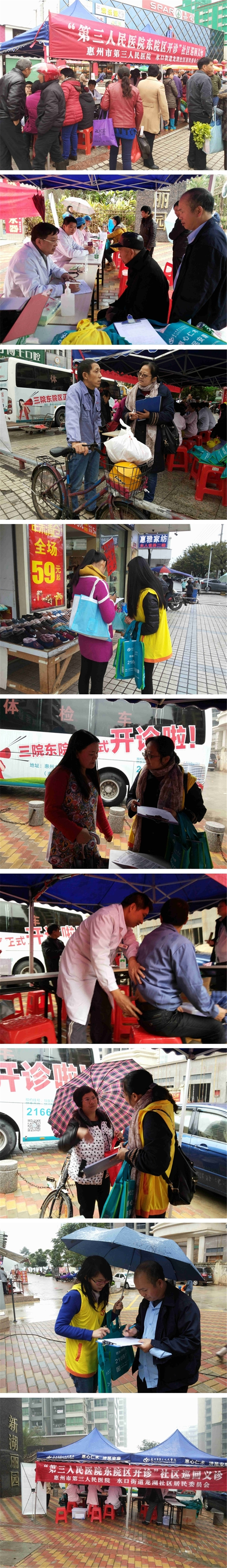 2016年1月16-17日,惠州市第三人民医院派出医疗志愿者服务队分别在龙湖社区华昌商场门口和龙湖社区新湖丽园小区开展义诊活动。为群众开展义诊项目有:血压、血糖常规检查,抽血检查(血脂2项+空腹血糖),骨科、眼科、内分泌、消化内科专家咨询及一个部位的B超检查(为保证质量,每天上午限前30名),得到居民热情参与。两天义诊总人数200余人次,微机血糖测量90人次,抽血(血糖、血脂两项)26人次,B超57人次,问卷调查140人次,发放宣传资料200份。
