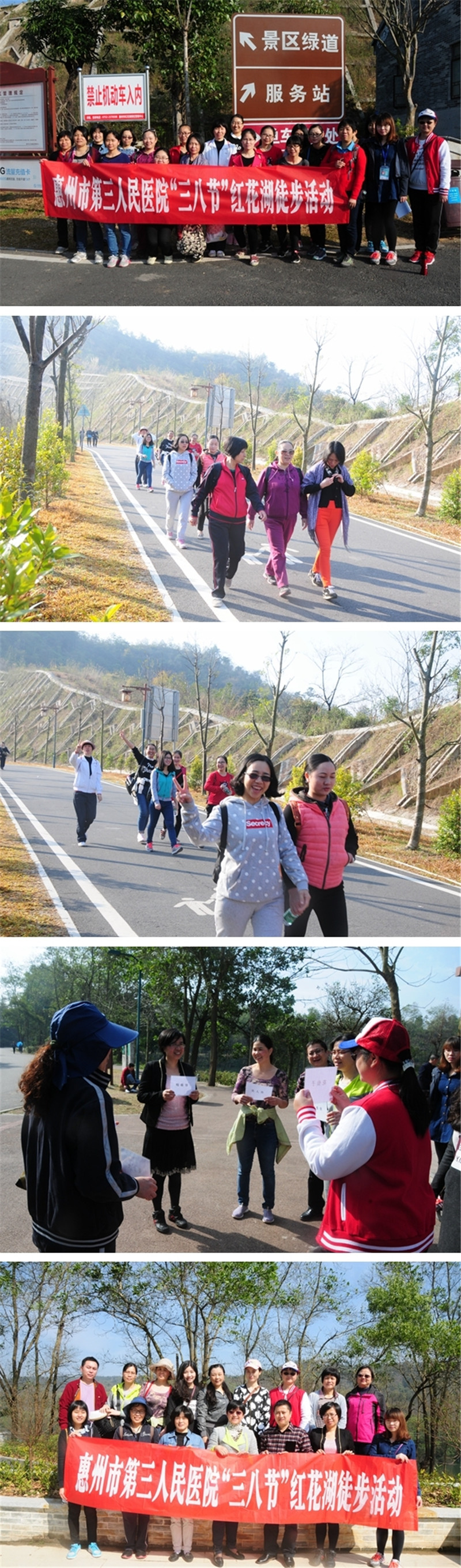 为庆祝“三八”妇女节,使广大女职工度过一个充实愉快、富有意义的节日,同时加强两个院区职工之间的了解和交流,惠州市第三人民医院医院工会(妇委会)组织女职工开展了红花湖徒步活动。此次活动共分两天,总共约有300名员工参加。在徒步终点位置还设置了游戏环节和有奖答题活动,增加了徒步活动的趣味性。