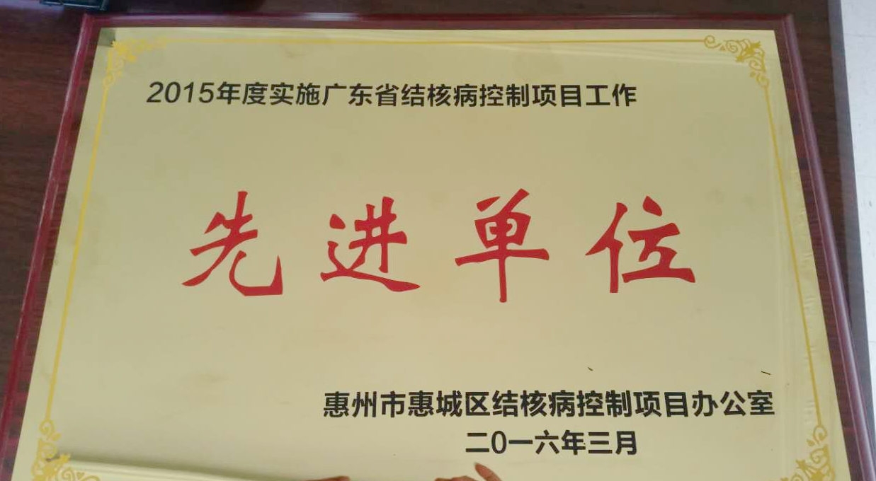 2015年是实施《全国结核病防治规划(2011-2015年)》的第五年。在惠城区卫计局和我院的组织领导下,通过全院医务人员共同努力下,有效治疗和转诊肺结核病人,在2015年顺利完成区卫生行政部门下达的肺结核病人归口管治任务,经惠城区人民政府同意,惠州市第三人民医院获得了2015年度实施广东省结核病控制项目工作先进单位称号。