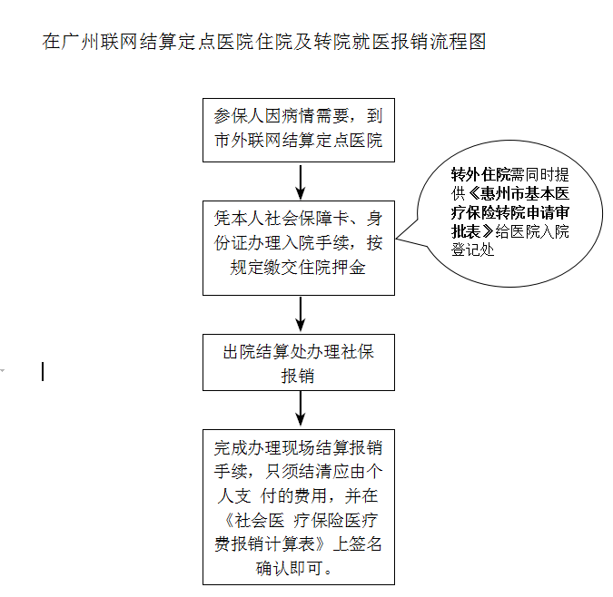 不直接在广州联网医院结算的类别:参保人因生育、保胎、意外伤害、新生儿(8个月内未参保)住院需转往广州定点医院住院的,惠州市内定点医院不需在社保系统录入转院登记信息,只需开具《惠州市基本医疗保险市内(外)转诊申请审批表》,住院费用报销手续待出院后回参保所属的社保经办机构(含社保所)前台受理。(医保部 龚再浩)