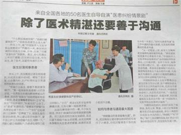 我代表我们广东小组扮演了一位妇产科医师,遇到一位没有剖宫产指征却又非要剖宫产的孕妇,我把在人文医学技能培训中所学习到的技巧运用到其中,轻松的说服了她,我们小组的节目也因此获得了最佳创意奖。不少医生坦言,学员们表演的四场情景剧都很熟悉。武汉市第三医院质控办医生吴娟说,其实只要不局限于医生的思维,由关注疾病本身转向关注患者的需要,医患的友谊小船就不会翻。