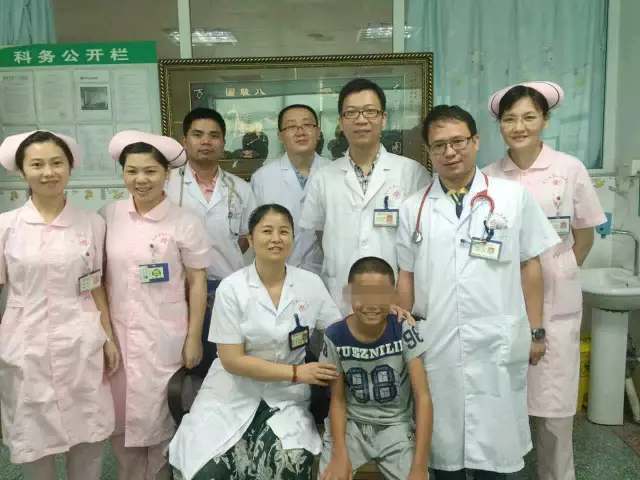 勇仔康复后开心与儿科医护人员合影