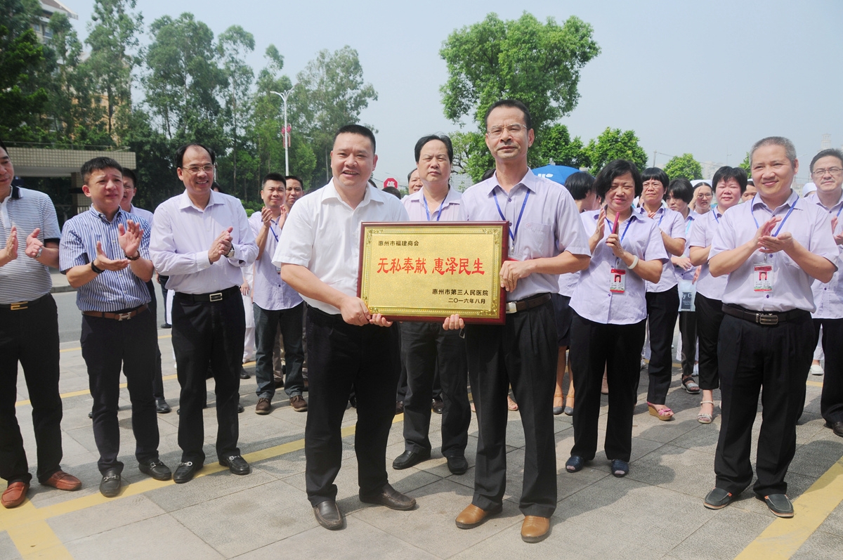 仪式上,惠州市福建商会黄新毅理事长在发言中指出,近年来市三院在全体职工的共同努力下,医院不断在加大基础设施建设,增添业务用房,加强就医环境的改造,为惠州市民健康保健工作做出了巨大的贡献。同时也希望我院在医疗环境、医疗设备、专科技术、服务质量等方面取得新的成效,在保障辖区群众的身体健康上迈出新的步伐。