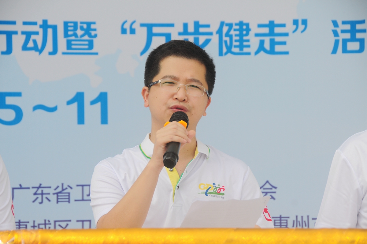 然后是各领导讲话了,惠州市卫计局宣教科苏秉成科长宣读了“健康中国行”健走活动的倡议书。没有健康,必将阻碍人的全面发展,没有全民健康,就没有全面小康。目前惠州各级卫计部门正按照健康中国、卫生强省、卫生强市的要求,大力加强健康教育与健康促进工作,采取多种形式,增强健康意识,引导群众养成健康生活方式,提高群众的健康素养,为建设卫生强市,打造健康惠州作出更大贡献。