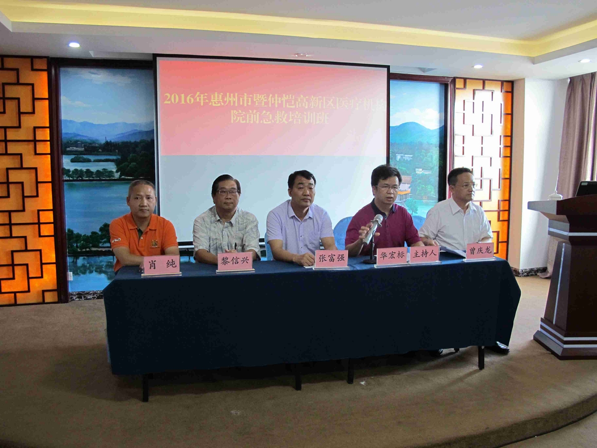 仲恺高新区宣教文卫办公室副主任华宏标(右二)主持,惠州市120急救指挥中心张富强主任(右三),仲恺高新区宣教文卫办公室卫生科曾庆龙科长(右一),市三院副院长、心血管医学中心主任肖纯博士(左一),香港圣约翰救护机构救伤队资深急救专家黎信兴教授(左二)等出席