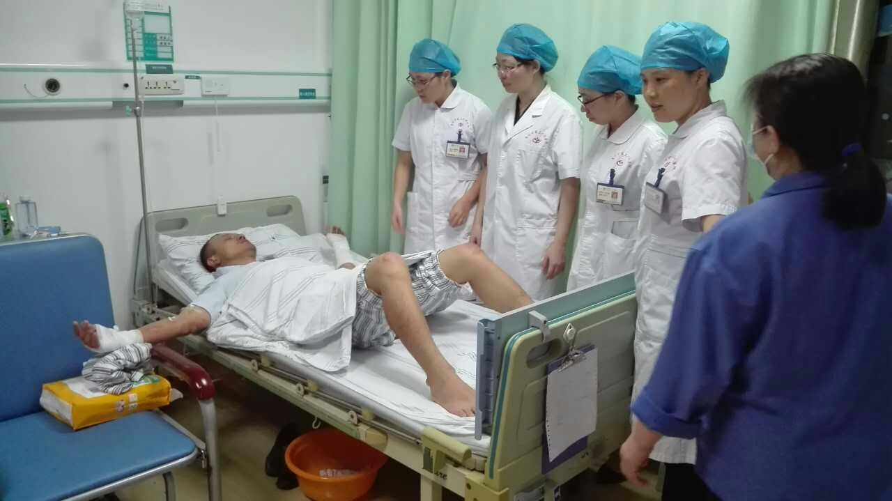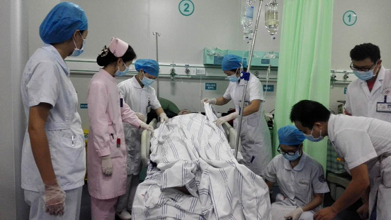 烧伤是突发性极强的意外伤害,对救护人员的反应能力、业务素质等要求特别高,在接到紧急救助通知后,急诊科二线班及护理总值迅速到达现场,协调处理。护理部了解情况后决定把实战与演练相结合,立即启动护理应急预案,办公平台短信、微信、电话三管齐下同时通知护理应急组成员,40余名护理应急小组成员在护理部主任的指挥下,积极响应、迅速到达现场参与抢救。导致全身大面积烧伤的患者,其中三名立即收治手足外科,另外七名伤势较重的患者马上送院本部急诊科,建立静脉通道、吸氧、抗休克、抗感染……一系列抢救治疗有条不紊进行着。
