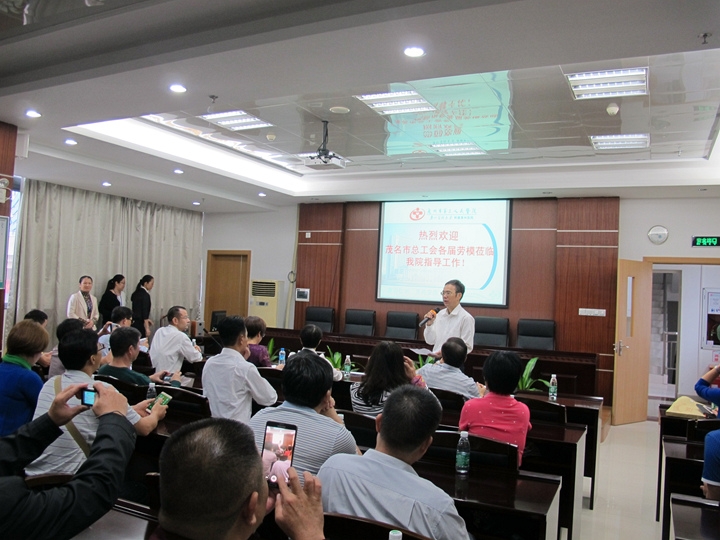 2016年11月22日上午,在惠州市总工会副主席曾红艳等的陪同下,茂名市各界劳模一行50余人来我院参观交流“劳模创新工作室”工作。院党委书记邓汉东、工会主席李淑兰迎接并陪同进行了参观交流。