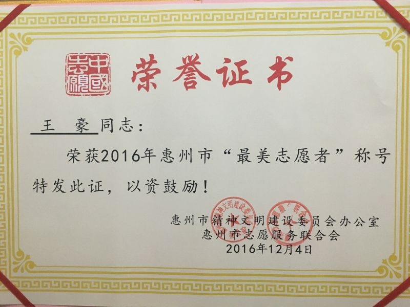 2016年12月4日上午,在2016年国际志愿者日来临之际,2016年“中国梦·志愿美”惠州公益志愿文化主题系列活动启动仪式在惠州市博物馆举行。会上,惠州市第三人民医院志愿服务队被授予“惠州市最佳服务组织”、“惠州市三星级志愿服务组织”荣誉称号,耳鼻咽喉头颈外科主任王豪被授予“惠州市最美志愿者”荣誉称号。