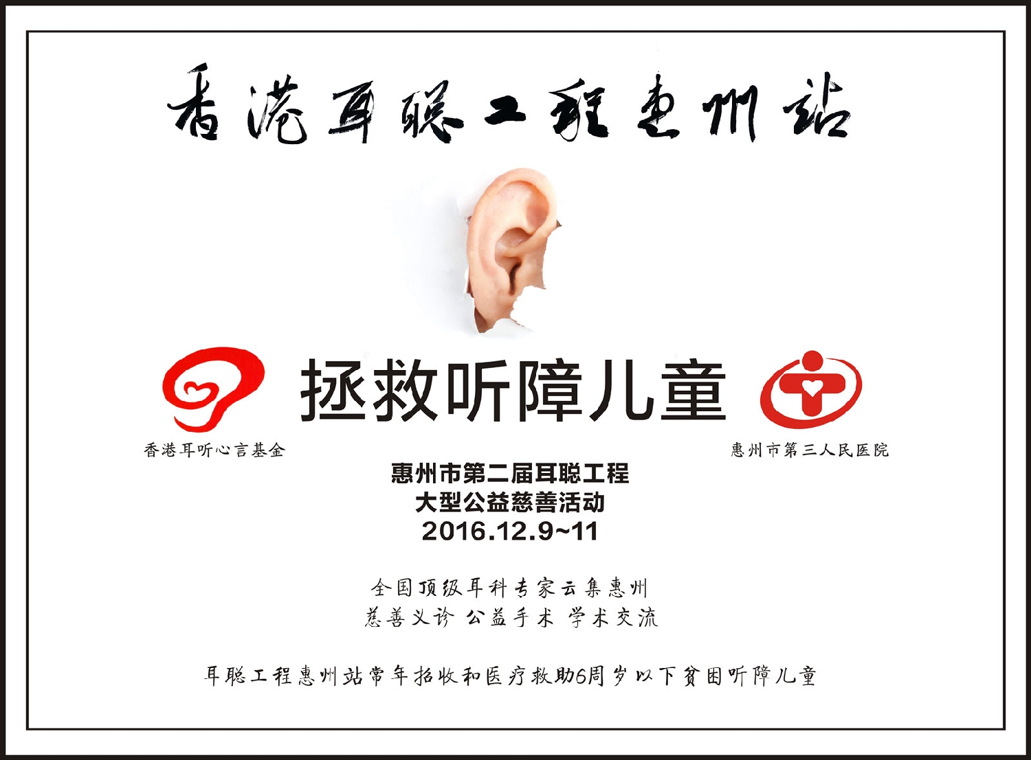 2015年5月,“香港耳聪工程”在惠州市第三人民医院成立了惠州站,并举行了惠州市第一届耳聪工程公益慈善活动,活动一年来募捐善款202万元救助患者,为56名贫困耳疾患者实施了手术(48名人工耳蜗植入手术,8名中耳炎手术),让听障儿童成功开口讲话,开启“有声世界”,引起社会广泛关注,香港和内地包括中央电视台、中国新闻网、广东卫视等多家媒体进行了报道。