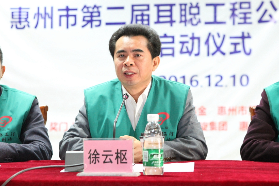 在12月10日上午活动启动仪式上,市委常委、区委书记徐云枢同志带着城区四套班子领导一行出席本次活动,徐书记对耳聪工程公益活动给予了高度肯定。他指出,耳聪工程活动是爱心的汇集,对整个惠城区建设健康之城、道德之城都有着向上的作用。徐书记表示真诚地期待和希望这个活动通过爱心人士的引领,能把这种爱心传递下去,让大家都来关爱弱势群体,让全社会都充满爱!