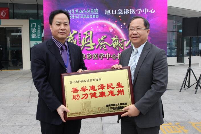为感恩杨勋先生和香港旭日集团,感恩惠州市外商投资企业协会、惠州市港澳慈善基金会、惠州市台商投资企业协会、惠州市汕尾商会、惠州市福建商会、深圳狮子会、惠州百信佳集团有限公司、天宝电子惠州有限公司、香港屯门狮子会、香港沙田狮子会等爱心组织和企业,医院特向各企业、组织团体和个人颁发了牌匾,以感恩他们对我院发展和公益事业开展以及对困难患者群众的帮扶做出的无私贡献!