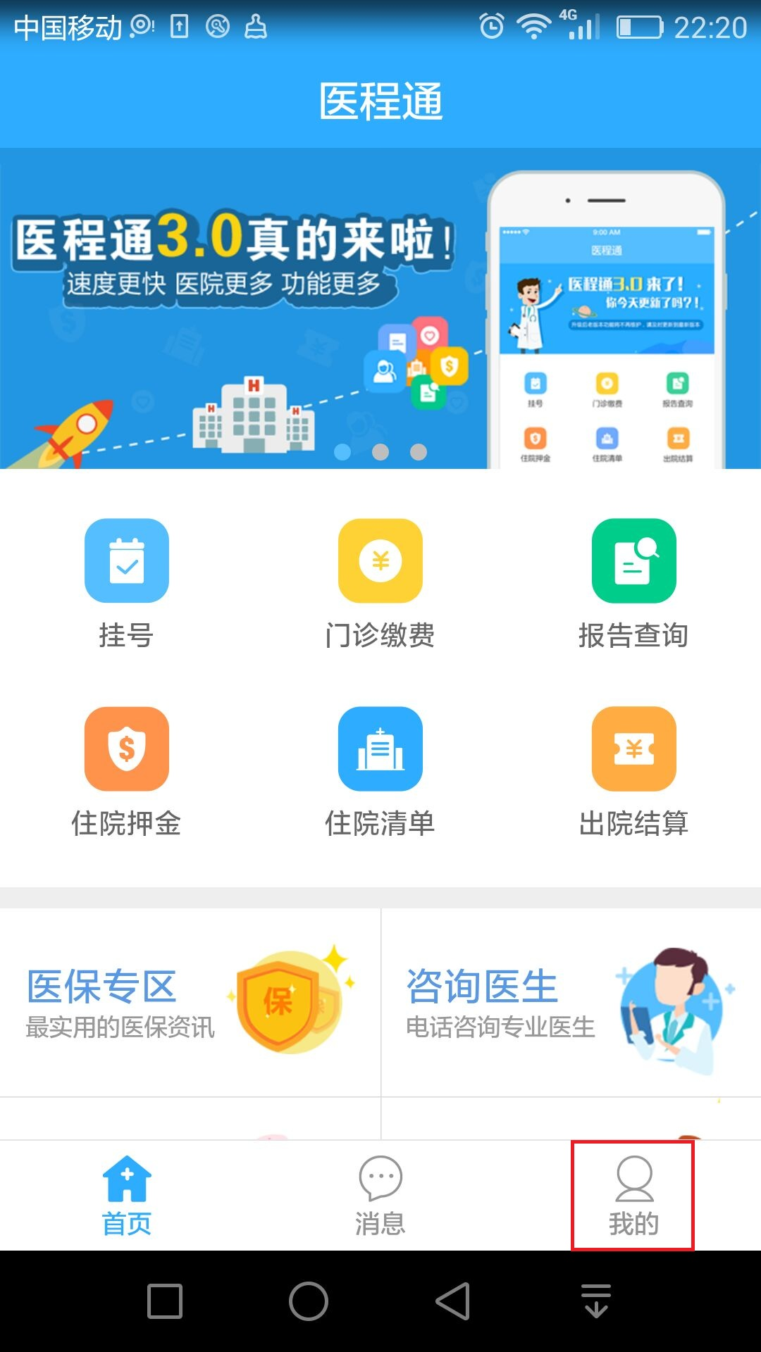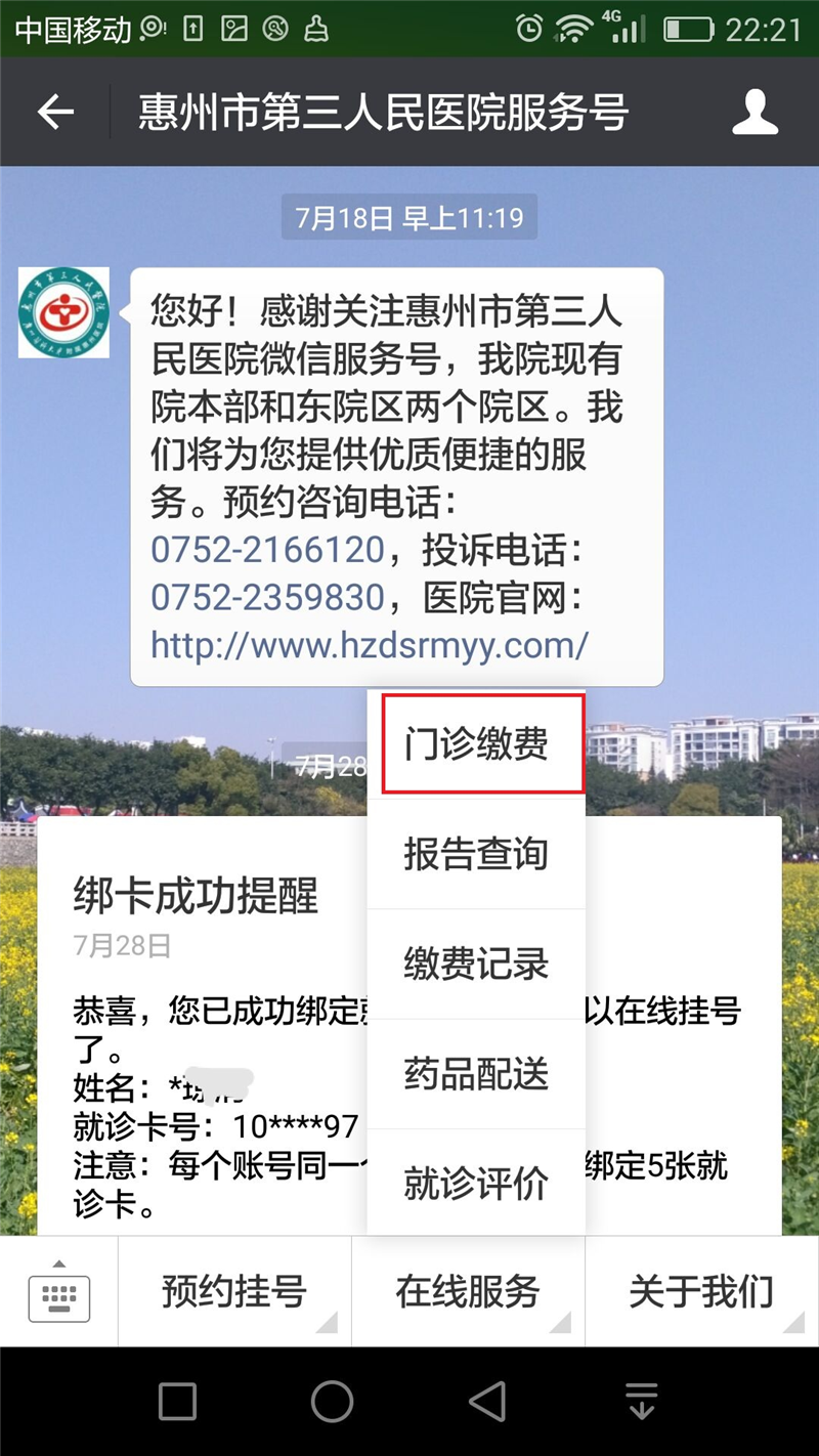 首次使用的亲们,需先完善个人信息并绑定诊疗卡号,如果没有诊疗卡,需到医院窗口办理,绑卡成功了可以通过手机在线上进行预约挂号、门诊缴费、检验报告查询等操作,其间不需要支付任何手续费。