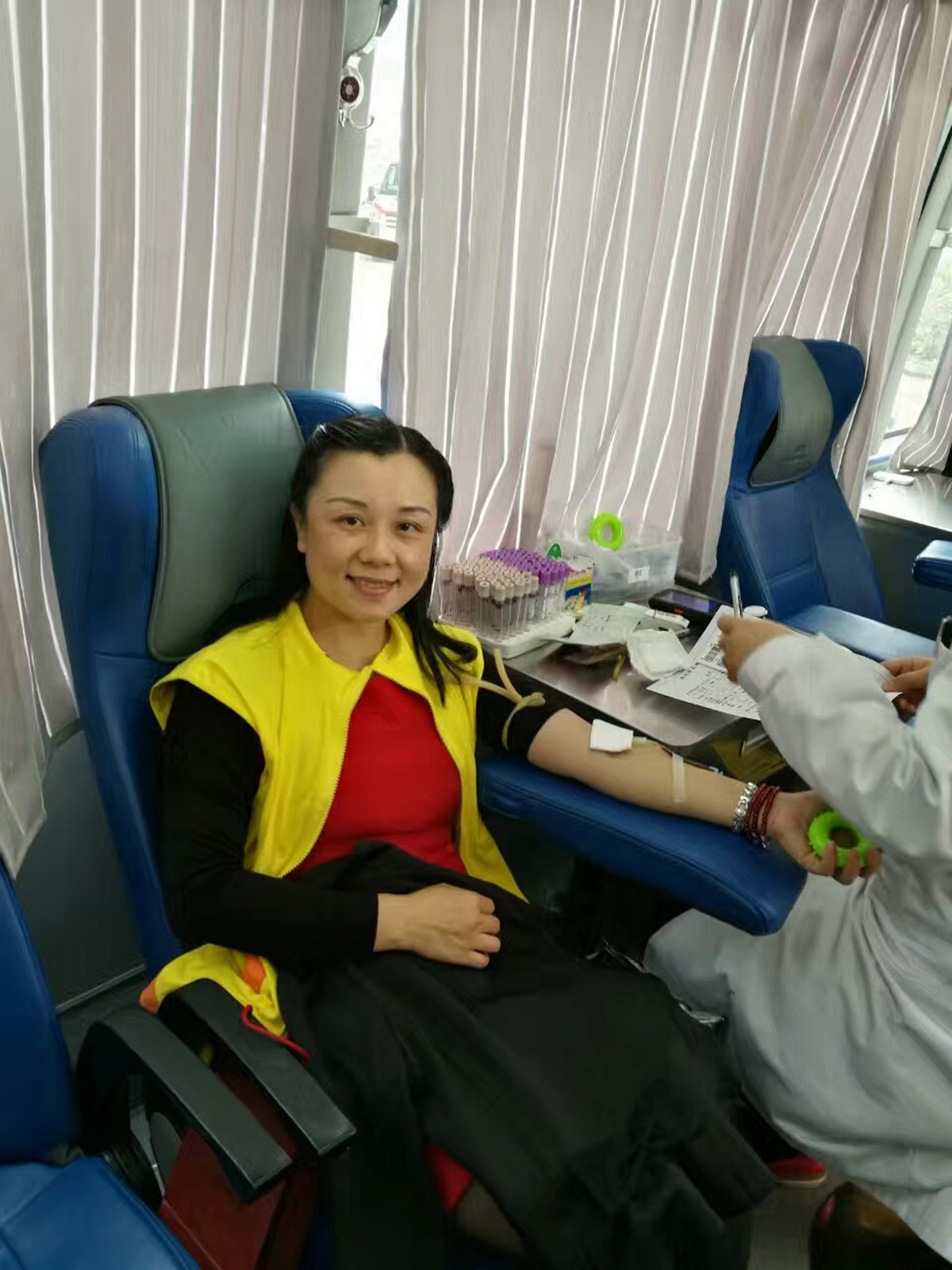 工会委员李彩珠带头献血,我看了她的献血证,连续献了8次,哇,真是“献血气质美女”!