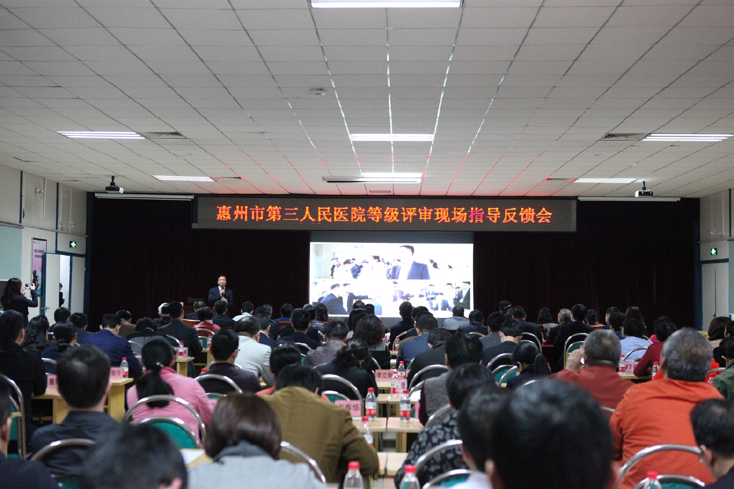 广东省医院管理评价质控中心专家组,惠州市惠城区区委常委、常务副区长翟树宇同志,惠州市卫计局副局长黄宜志同志,惠城区卫计局党委书记、局长邹忠平同志,惠州市第三人民医院院长马显力、党委书记邓汉东同志等院领导班子成员及医院中层干部,共200多人出席参加了本次反馈会。