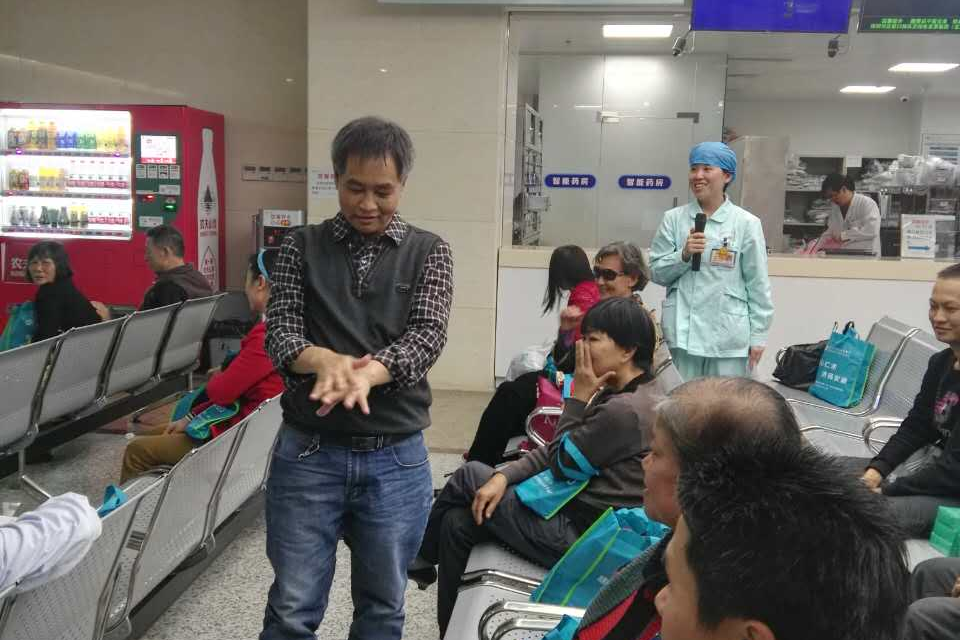 最后最热闹的就是透析知识抢答环节,肾内科为大家准备了丰富而贴心的礼品,提问的都是大家经常遇到的需要掌握的透析常识,肾友们积极踊跃的抢答,看,下面这个阿叔为大家示范的六部洗手法法多标准啊!