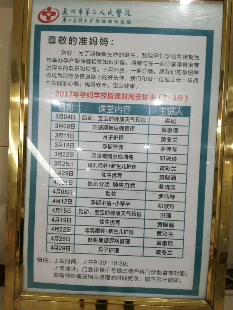 惠州市第三人民医院3、4月份的课表已经出来了,欢迎各位准爸爸妈妈积极参与这些课程哦!(产科 罗伟琴)
