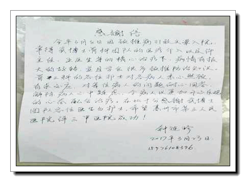 2017年3月24日上午,惠州三院颈肩腰腿痛科又收到了一封来自患者钟阿姨亲笔写的感谢信。信中表达了对颈肩腰腿痛科的医务人员浓浓的感激之情。