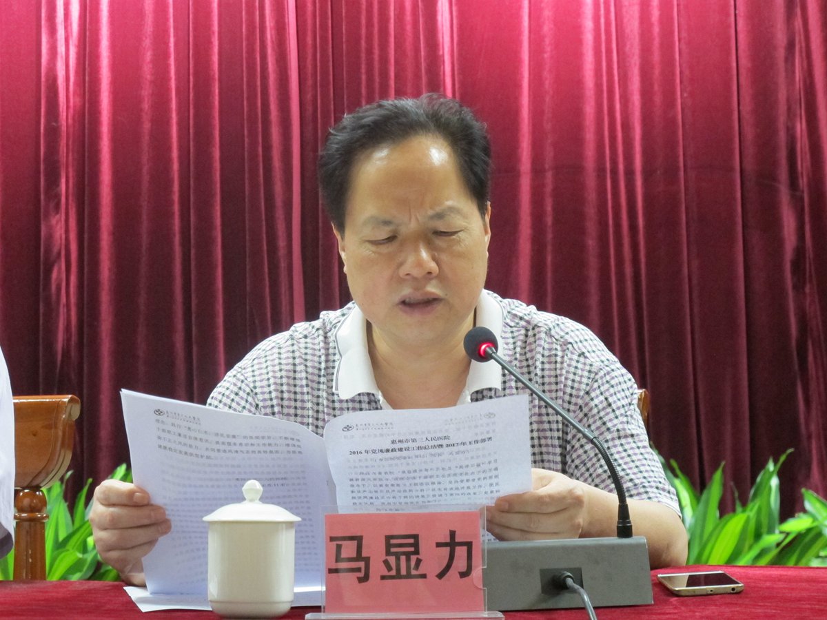马显力院长总结了我院2016年党风廉政建设工作情况,部署我院2017年党风廉政建设六大任务:一是坚持完善医院廉政工作机制,夯实医院廉政工作基础,二是加强队伍自身建设,增强队伍廉洁意识,三是重点抓突出问题整改,维护医院良好形象,四是严抓工作不作为、慢作为现象,提高医院工作质量,五是严肃行业纪律,自觉接受上级及社会监督。六是发挥党员干部及先进典型的引领作用。