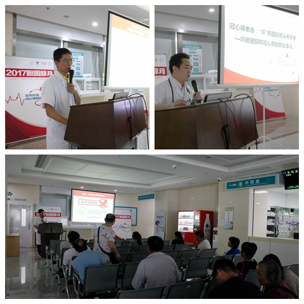 活动由认识胆固醇大型义诊和胆固醇管理健康讲堂组成,吸引了大批市民前来参加。护士们采用血脂快速测定仪为前100名参与市民检测微机血脂,心脑血管专家结合血压和既往健康史进行解释,并送上胆固醇管理宣教手册,市民们表示既便民又贴心。健康讲堂更是请出神经医学中心副主任黄志勇主任医师和心血管医学中心副主任钟思干主任医师亲临现场,为大家讲解如何管好胆固醇,远离脑梗,以及“坏”胆固醇和冠心病的那些事儿,配合课件和视频给大家科普胆固醇异常给血管带来的危害,如何预防以及当心梗脑梗发生时该如何急救。