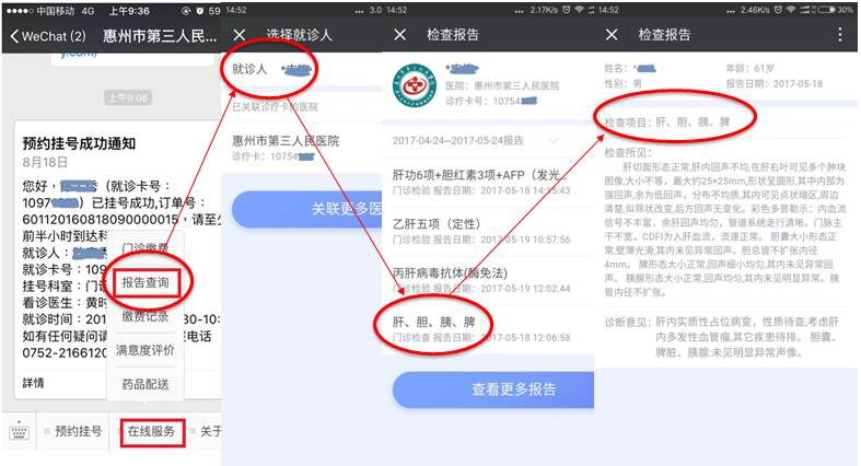 为了改善患者就医体验,提供更加方便、快捷的医疗服务,惠州市第三人民医院继去年开通微信服务号、支付宝、医程通APP三大移动平台,实现了线上预约挂号、门诊缴费、检验报告查询、就诊评价后,近日又进一步完善了超声检查报告查询功能。不论何时何地,只要有网络,用户可第一时间通过手机查看超声检查、检验报告,省时又省力。