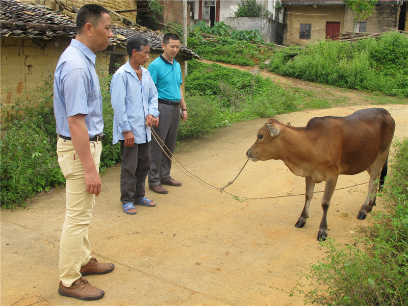 李助理和叶主任与贫困户张运强在交流黄牛的养殖经验