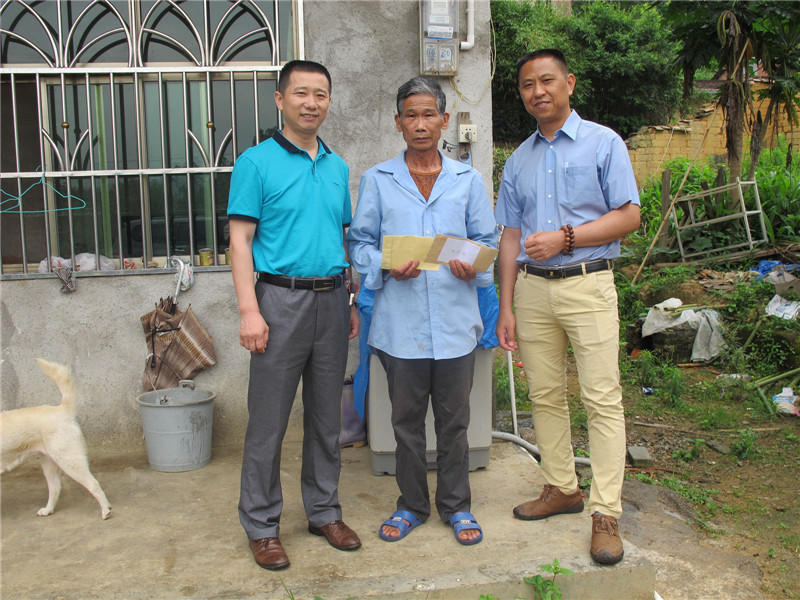 2017年5月19日早上,天空虽然下起了小雨,但也阻挡不了他们下乡扶贫计划。经过1个半小时的颠簸车程,他们来到了芦洲镇岚石村结对帮扶对象张运强的家中。风雨中带来的关爱最令人感动,张运强如见到亲戚似的,热情地迎接他们。