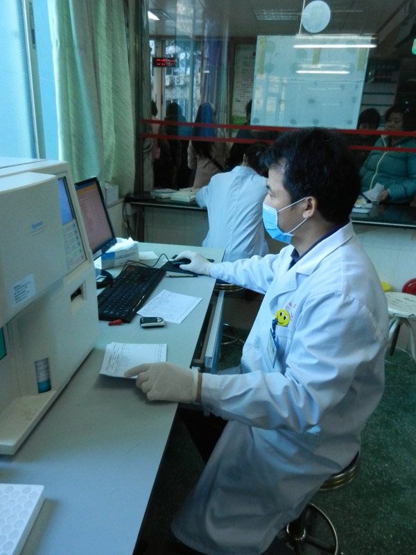 “陈组长,还没下班啊”?交接完夜班后,已经是晚上六点了,我看见他还在埋头维修着仪器。旁边的同事接上话说:“今天早上仪器坏了,组长他一直修到现在,中午饭还没吃呢!”听了顿时心里一震,晚饭时间都到了,中午饭还没吃,我说再忙也要吃饭啊。他皱了皱眉头说:“仪器有故障、只有快点把仪器修好,及时把报告单发出去才不会耽误病人看病。”