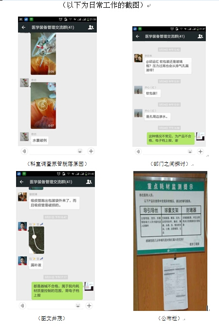 微信,现阶段最便捷的沟通工具,基本上人人都有。9月,召开临床科室设备管理员培训后,要求科室管理员扫描添加微信群。目前基本上每个科室管理员都在群中,此外还包括医学工程部人员。在日常工作中,科室发现器械存在问题时,都在群里咨询与探讨。这不仅及时解答临床的疑惑,而且提高了工作积极性与效率,也弥补了负责人临床知识不足的问题。同时,医学工程部定期将广东省药品不良反应监测中心发布的医疗器械不良事件通报和器械知识库的内容普及给各临床科室管理员学习。这不仅促进了临床科室更加重视器械不良事件监测与上报,而且提高了临床科室设备管理员对事件的识别能力。此外,每到月未,医学工程部温馨提示各科室上报情况,并要求科室及时提交未上报的事件。