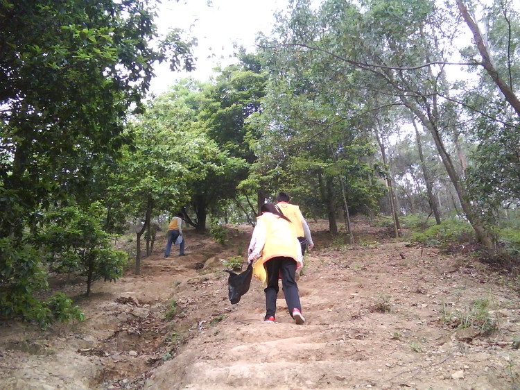 我和朋友登上亭子的二楼,顾不上流连美丽的山景,倾听山鸟的旋律,因为眼下那片“黄马甲”就是最靓丽的风景。我们猜他们是惠州学院的学生,是一群充满朝气,热爱生活热爱自然的环保主义者。那一次次的弯腰,拾起的不单是垃圾,也是一种文明和修养;那一张张标语,写下的不只是文字,也是一种诚挚的呼唤和希望。他们就像一群快乐可爱的黄精灵,用自己的实际行动,为美丽的山林带来和谐的景象。