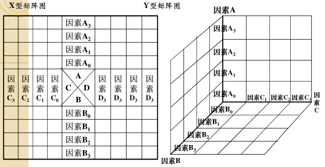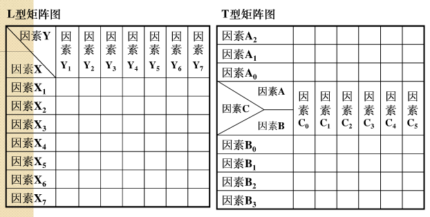手法五:矩阵图,是将与问题有关的因素分别配置于“行”与“列”,利用因素与因素的交点来了解彼此间是否有关联及关联程度,然后借助交点有效解决问题的方法。分为L型、T型、X型、Y型四个类型。