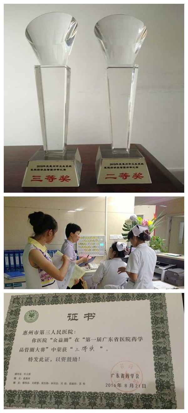 为此,药学部进行了建立完善的药品管理信息系统 、药品管理(高警示药品,急救药品、低温储存药品、遮光避光药品及易混淆药品)、贮存药品的场所、设施与设备的持续改进项目三个项目化管理,并分别针对降低骨科一类切口围手术期抗菌药物使用的不合理率、降低住院药房的调配差错率、降低门诊处方调配差错率成立了护航圈、众益圈、药安圈三个品管圈,其中众益圈和护航圈在2015年度惠州市卫生系统医院药学品管圈评审比赛中分别荣获二、三等奖,众益圈更是脱颖而出,代表惠州地区在广东省医院药学品管圈大赛中荣获“三等奖”,取得了惠州市医疗机构在该项比赛中的最佳成绩。