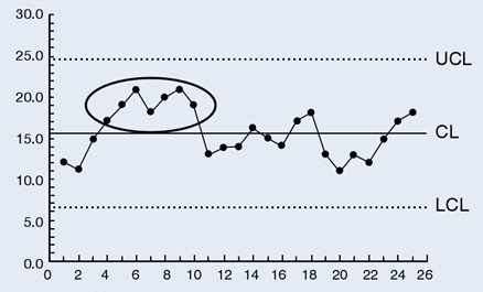 例:异常管制图-连续7点出现在中心线的一方