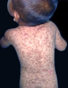 本病的临床表现具有特征性:一患病即会出现高热、结膜充血、流涕等症状;患病2~3天后,在第二臼齿对面的颊粘膜上,出现蓝白色或紫色小点,周围有 红晕,称为Koplik斑;起病后第4天开始发疹,按照耳后、发际、颜面、颈部、上肢、躯干、下肢的顺序出疹;5~7天后体温下降,症状减轻,皮疹按出疹顺序逐渐消退,病程约2周。可并发支气管肺炎、中耳炎脑炎、心血管功能不全以及结核病变播散等并发症,一般较为少见。
