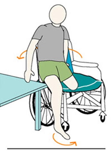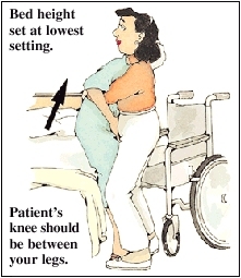 ③以好脚为中轴站在地上支撑身体,一手扶床边,一手扶轮椅扶手,带动身体移向轮椅坐下。