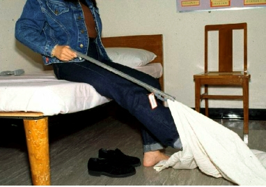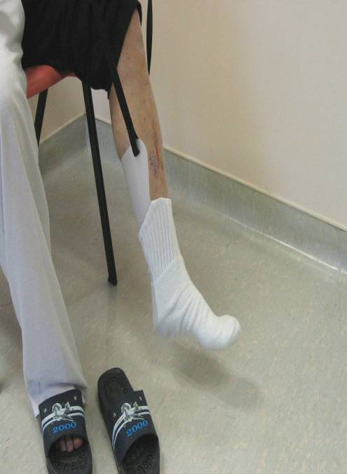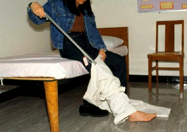 2. 坐下,先脱好脚裤,再利用辅助器具如长柄取物器,除患脚那边的裤管,利用好脚将裤管从患脚踢下。