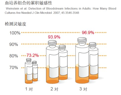成年患者推荐的采血量为20~30ml, 每套不少于10ml,每瓶不少于5ml。婴幼儿患者推荐的采血量应少于患儿总血容量的1%,每瓶不少于2ml。按照规范要求,通常进行血培养一次要采集2~3套,也就是4~6瓶血液标本。研究显示,对于血流感染,只采1套血培养阳性率仅为65%、2套为80%、3套可以达到96%。所以,要想获得较高的阳性检出率,就需要送检多套血培养,这是科学的要求。其实,对于正常血培养,总血量40~60毫升可以使阳性率接近最大值,而这一血量仅占正常人血量的1/100,所以一般不会对患者的健康造成损害。相反,不足量的采血,会使血培养检出率下降,甚至失去意义。